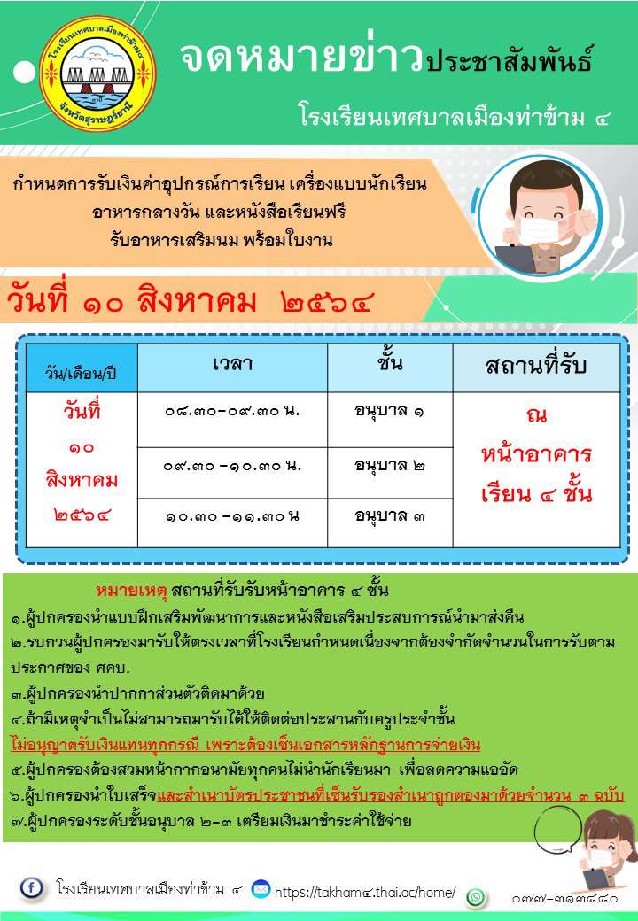 กำหนดการรับเงินค่าอุปกรณ์การเรียน เครื่องแบบนักเรียน